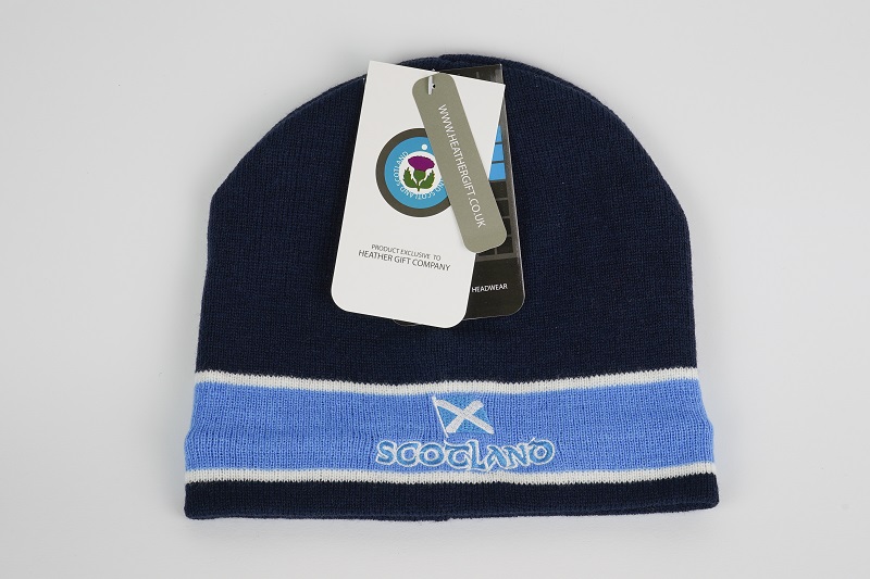 Beanie Hat Scotland Saltire, mit aufgesticktem Scotland Schriftzug und Saltire Flagge, 100% Baumwolle. Hergestellt für Heather Gift Company, Scotland.