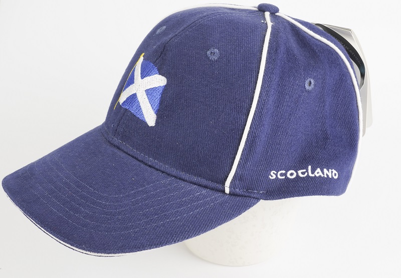 Baseball Cap Saltire Navy, mit aufgesticktem Scotland Schriftzug an der Seite, Saltire Flagge vorne und Distel hinten, 100% Baumwolle. Größenverstellbar. Hergestellt für Heather Gift Company, Scotland.