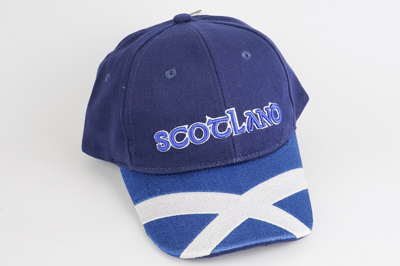 Baseball Cap Scotland Saltire, mit aufgesticktem Scotland Schriftzug und Saltire Flagge auf dem Kappenschirm, 100% Baumwolle. Größenverstellbar. Hergestellt für Heather Gift Company, Scotland.