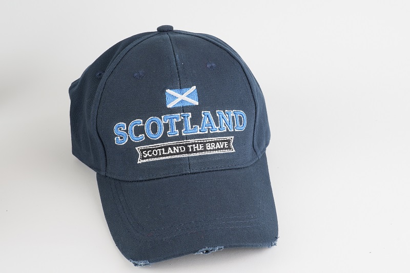 Baseball Cap Scotland The Brave Navy, mit aufgesticktem Scotland, Scotland The Brave Schriftzug und Saltire Flagge, 100% Baumwolle. Größenverstellbar. Im coolen Used Look! Hergestellt für Heather Gift Company, Scotland.