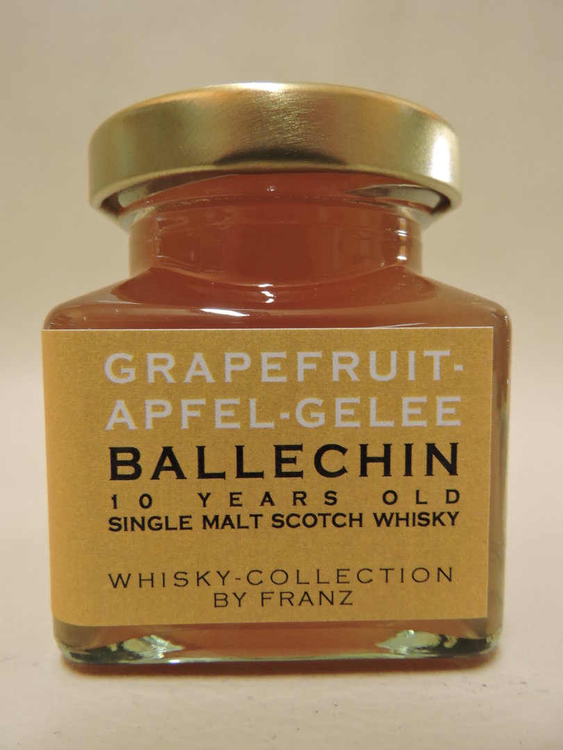 Grapefruit Apfel Gelee verfeinert mit Ballechin 10 Jahre Single Malt Scotch Whisky, 150g Glas. Fruchtgehalt 48%. Handgemachter Fruchtaufstrich von der Marmeladenmanufaktur Franz in Hoyerhagen.