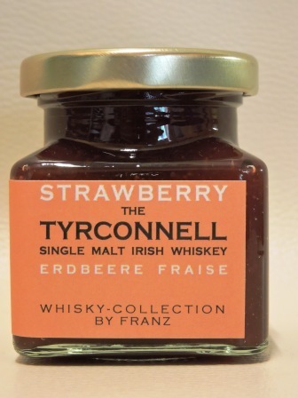 Erdbeer Marmelade verfeinert mit Tyrconnell Single Malt Irish Whiskey, 150g Glas. Fruchtgehalt 48%. Handgemachter Fruchtaufstrich von der Marmeladenmanufaktur Franz in Hoyerhagen.