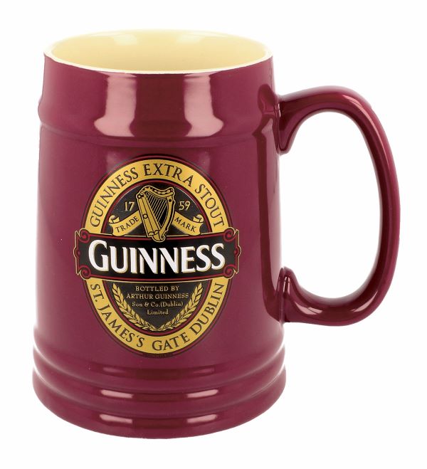 Guinness Keramik Tankard weinrot, ca. 740 Gramm Eigengewicht, 13,5cm hoch und 9cm Durchmesser. Füllmenge ca. 500ml. Der klassische Bierkrug mit Guinness Extra Stout Logo Relief Aufdruck, ein Muss für jede Bar!