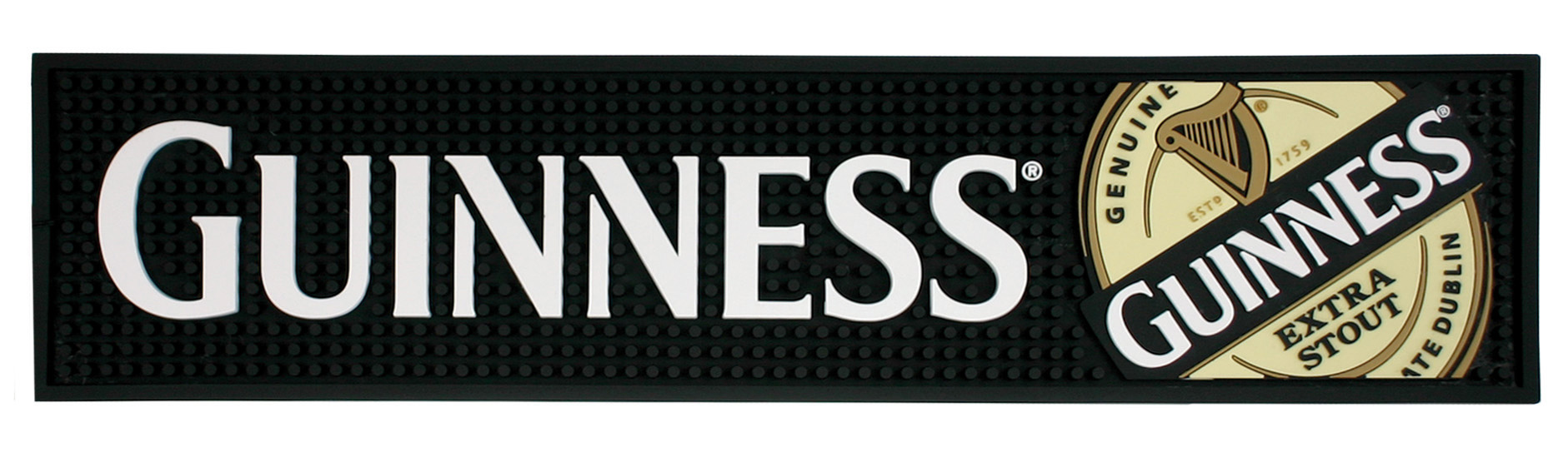 Guinness PVC Barmatte genoppt, schwarz mit weißem Guinness Schriftzug und Logo. Länge 47cm, Breite 11cm. Ca. 8mm dick. Ein Muss für die hauseigene Bar!