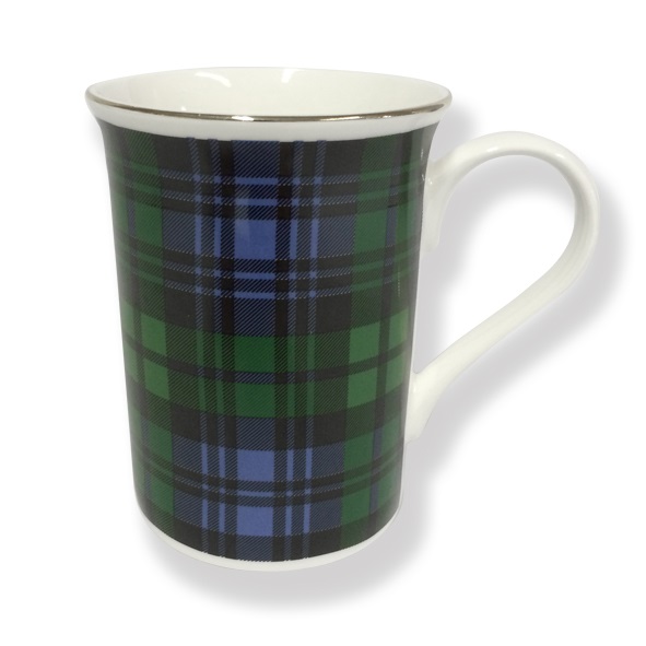 Bone China Tasse mit Black Watch Tartan Aufdruck. Füllmenge ca. 300ml, Durchmesser am oberen Rand ca. 8cm, Höhe ca. 10,5cm. Nicht spülmaschinengeeignet.