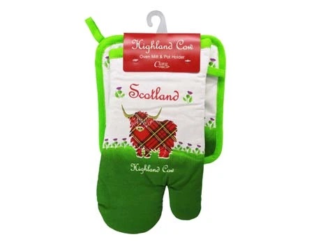 Ofenhandschuh und Topflappen Set Highland Cow von Royal Tara, Galway. 100% Baumwolle. Größe Ofenhandschuh Höhe 33cm, Breite 15cm. Größe Topflappen Höhe 22cm, Breite 22cm.