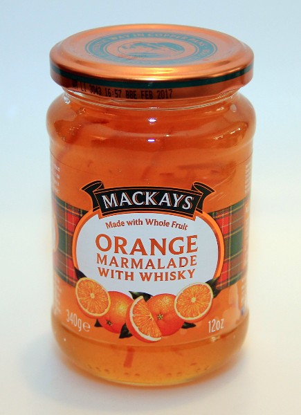 MACKAYS Orange Marmalade with Whisky, Orangen-Marmelade mit Whisky und dünn geschnittener Orangenschale, 340g Glas. Hergestellt in Schottland von MACKAYS Ltd. für Groco Food GmbH, Deutschland.