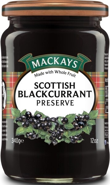 MACKAYS Scottish Blackcurrant Preserve- schwarze Johannisbeer Konfitüre, 340g Glas. Hergestellt in Schottland von MACKAYS Ltd. für Groco Food GmbH, Deutschland.