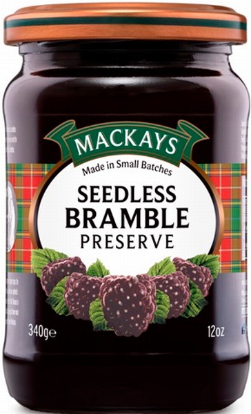 MACKAYS Scottish Seedless Bramble Preserve - kernlose Brombeer Konfitüre, 340g Glas. Hergestellt in Schottland von MACKAYS Ltd. für Groco Food GmbH, Deutschland.
